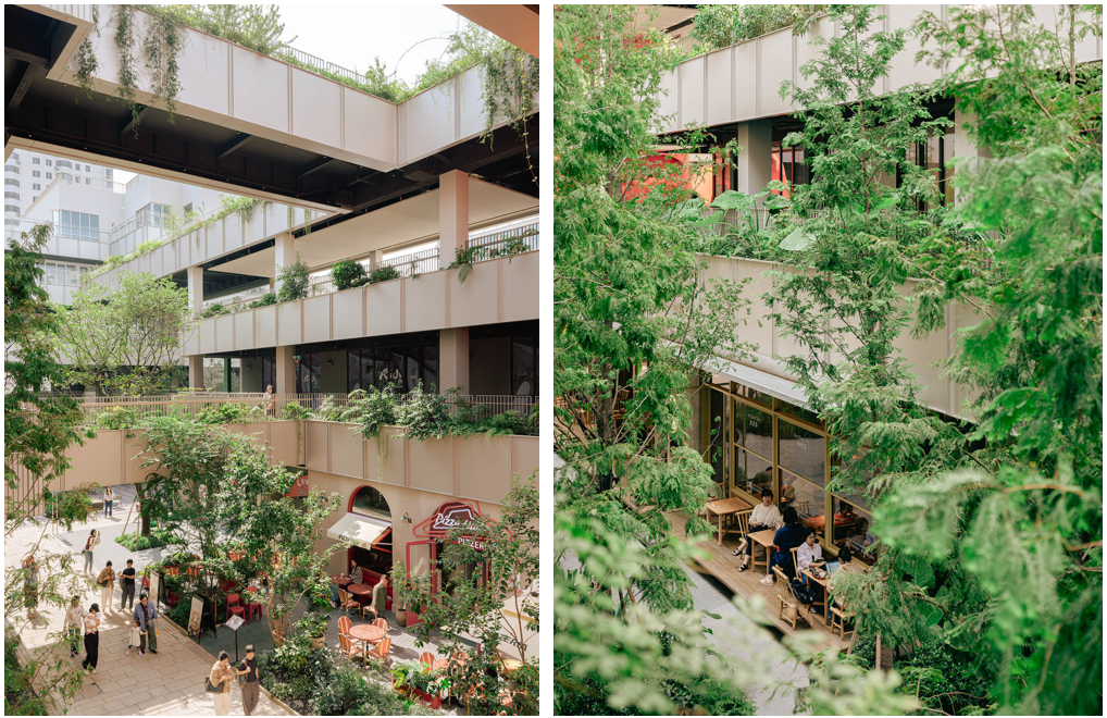 在场所营造上,项目巧妙地穿插了大面积的绿化空间。不同高度的植被如杉树、蕨类等,经过精心布置,打造富有层次感的自然生态场景,营造充满松弛感的空间氛围。外摆式餐饮和精心打造的休憩空间,让个角落都成为深度交流的理想场所。屋顶花园、小阳台和街角花园等区域鼓励人们驻足,探寻城市发展的足迹。
