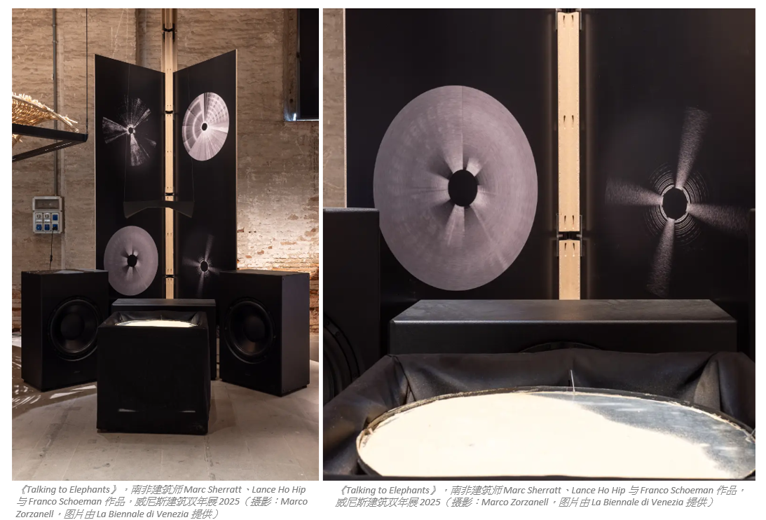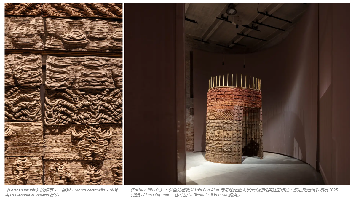 在开幕期间,Ratti明确阐述这场展览的使命: “面对一个燃烧的世界,建筑必须运用我们周遭的一切智慧。"不少建筑师尝试将这一理念付诸实践的例子。 当中许多积极探索人工智能与自然世界互动的可能性。 例如,南非建筑师Marc Sherratt、Lance Ho Hip与Franco Schoeman的《Talking to Elephants》运用AI人工智能驱动的基建,协助大象横跨一千公里的公共与私有土地迁徙; 以色列建筑师 Lola Ben-Alon 以及哥伦比亚大学 “天然物料实验室"的《Earthen Rituals》则利用 人工智能结合3D打印技术,将建筑废料转化为泥土纤维瓦片,搭建出精致的土砖凉亭。 另一类作品则着眼于自然过程:纽约事务所Diller Scofidio+Renfro建构的生物过滤系统,能将威尼斯潟湖水净化至足以冲调意式浓缩咖啡的程度。 乍看似乎讲求噱头,但若能规模化,这种技术或许能为整座城市提供洁净水源。