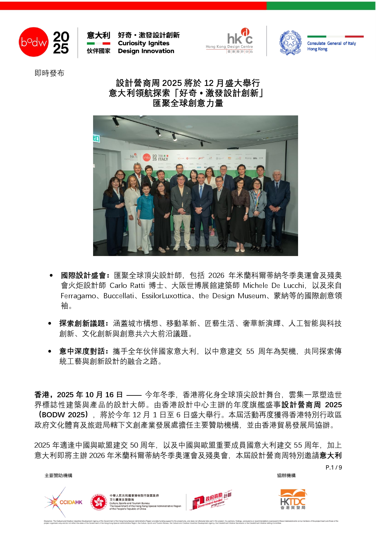 即時發布 - 設計營商周2025將於12月盛大舉行 意大利領航探索「好奇 • 激發設計創新」 匯聚全球創意力量