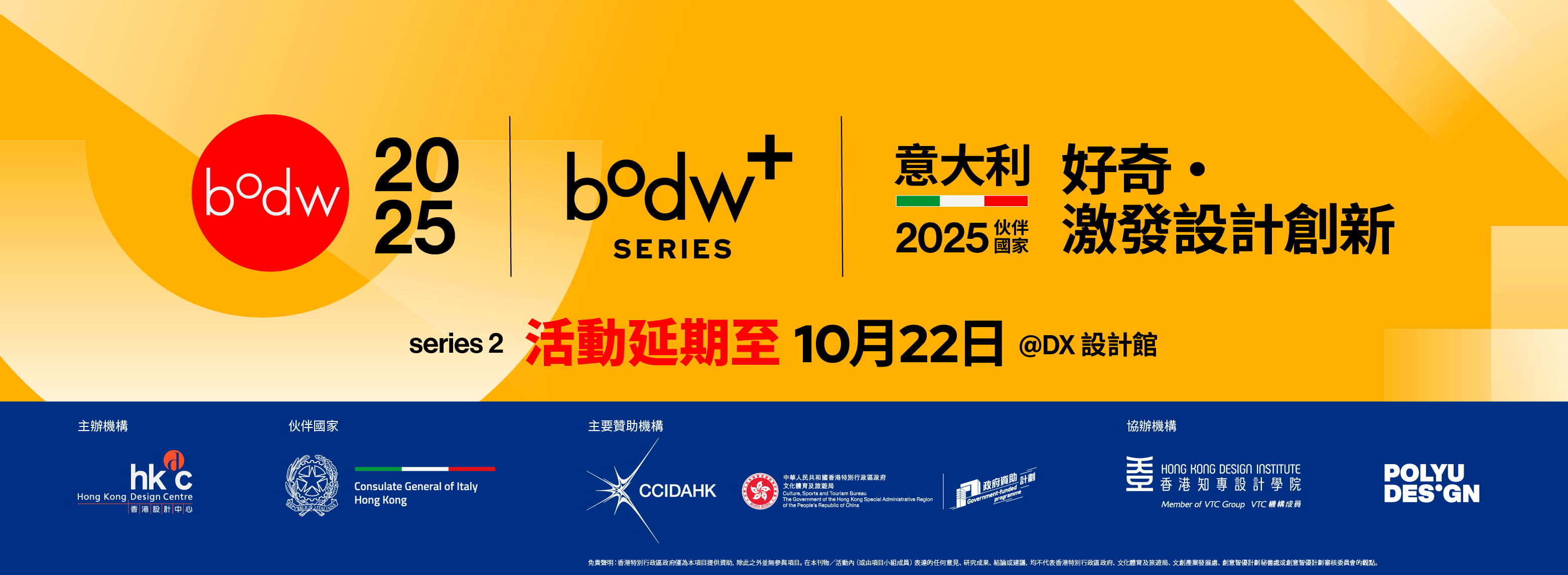 bodw+ Series(前身為「設計智識周」)將延續「設計營商周」的傳統,於6月25日、10月22日和10月23日舉辦連串精彩活動, 旨在加強香港設計界與伙伴國家意大利之間的知識交流和創新合作。