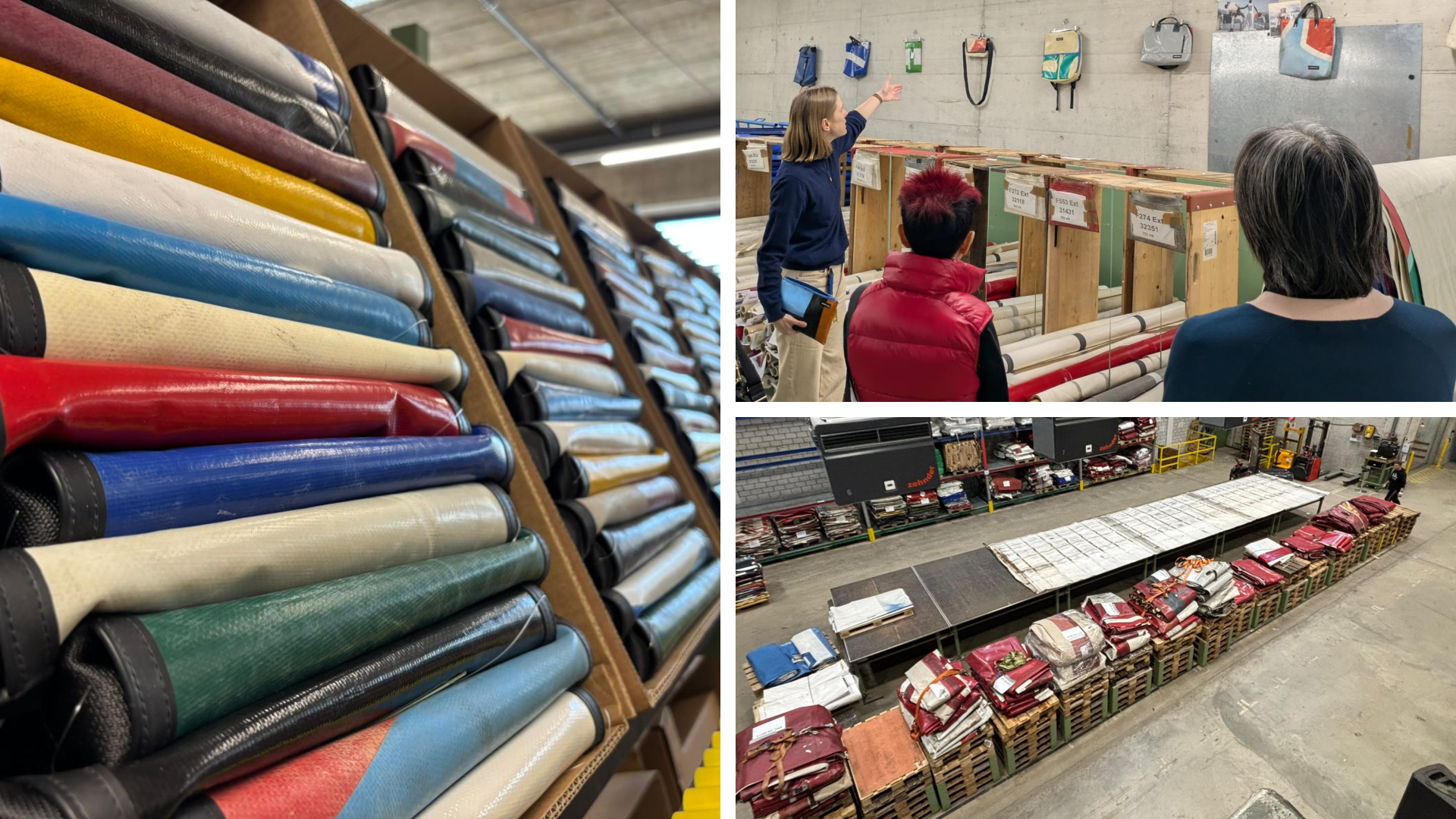 FREITAG — Switzerland’s circular design pioneer. The brand upcycles used truck tarps, seat belts, and bicycle inner tubes into rugged bags and accessories, advancing circularity through repair, resale, and mono‑material FABRIC textiles. During our visit to the Zurich production site, delegates saw eco‑efficient machinery in action.