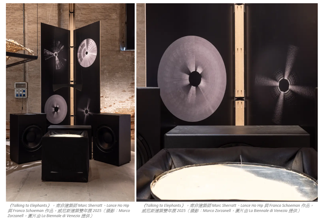 在開幕期間,Ratti 明確闡述這場展覽的使命:「面對一個燃燒的世界,建築必須運用我們周遭的一切智慧。」不少建築師嘗試將這一理念付諸實踐的例子。當中許多積極探索人工智能與自然世界互動的可能性。例如,南非建築師 Marc Sherratt、Lance Ho Hip 與 Franco Schoeman 的《Talking to Elephants》運用 AI人工智能驅動的基建,協助大象橫跨一千公里的公共與私有土地遷徙;以色列建築師 Lola Ben-Alon 以及哥倫比亞大學「天然物料實驗室」的《Earthen Rituals》則利用 人工智能結合3D打印技術,將建築廢料轉化為泥土纖維瓦片,搭建出精緻的土磚涼亭。另一類作品則著眼於自然過程:紐約事務所 Diller Scofidio + Renfro 建構的生物過濾系統,能將威尼斯潟湖水淨化至足以沖調意式濃縮咖啡的程度。乍看似乎講求噱頭,但若能規模化,這種技術或許能為整座城市提供潔淨水源。