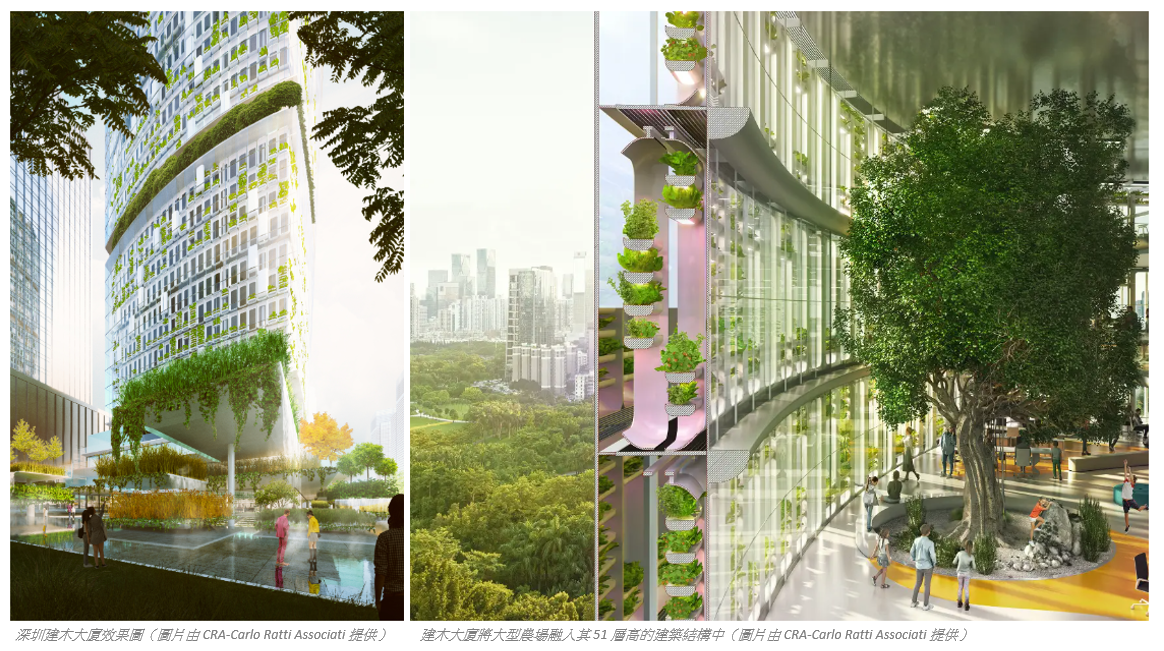 另一個實驗性計劃是 2021 年發表的「建木大廈」。這棟位於深圳、高達 218 米的摩天大樓,外牆設有一萬平方米的水耕農場,由人工智能「虛擬農藝師」管理,預計每年可生產 27 萬公斤新鮮農作物。