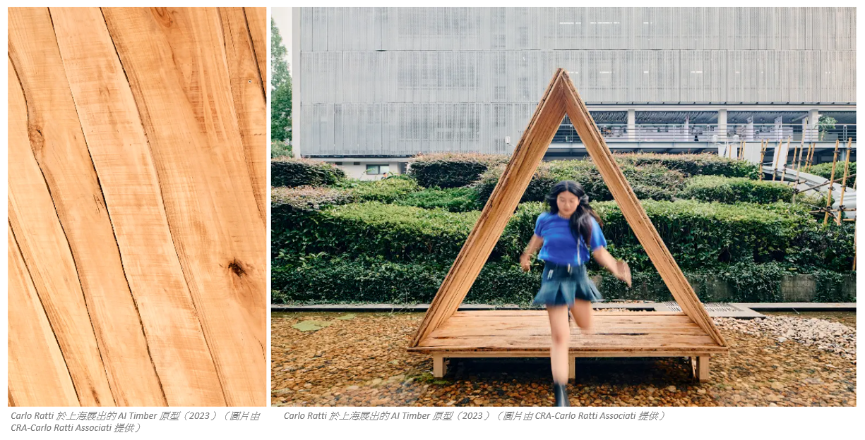 在他主理的建築事務所 Carlo Ratti Associati 中,這種理念更為鮮明。以 2023 年於上海展出的「AI Timber」原型為例,透過人工智能引導技術打造交叉層壓木材結構——成為碳密集型混凝土的可循環替代方案。技術成功 在切割過程中保留每棵樹的天然紋理,比傳統方法減少約三成浪費。